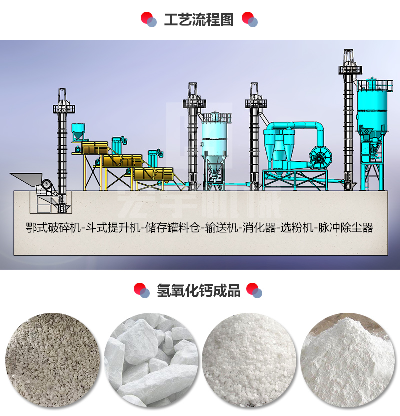 將合格的氧化鈣(CaO)塊料由鄂式破碎機破碎至20mm左右粒度,經(jīng)斗式提升機送入氧化鈣儲存罐料倉,料倉中的氧化鈣經(jīng)穩(wěn)流輸送機定量穩(wěn)重系統(tǒng)進入氫氧化鈣Ⅰ級消化器進行初步消化,當氫氧化鈣完成初級消化以后進入Ⅱ級消化或Ⅲ級消化器,使氧化鈣消化分解,生成合格的氫氧化鈣初級產(chǎn)品,消化率達到98%,(消化系統(tǒng)根據(jù)產(chǎn)能要求,機型設計分為單軸、雙軸及多軸機型)。消化分解好的氫氧化鈣再由半成品螺旋輸送機送入選粉機內(nèi),由選粉機完成產(chǎn)品雜質(zhì)分離和細度分級,完成分級后的終端合格產(chǎn)品,由成品輸送機、提升機卸入成品氫氧化鈣罐倉進行分別包裝。本套生產(chǎn)線所有污染節(jié)點由脈沖除塵器完成,收塵率達到99.5%。