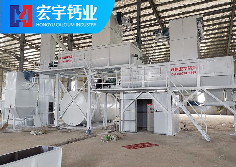將合格的氧化鈣(CaO)塊料由鄂式破碎機(jī)破碎至40mm左右粒度,經(jīng)斗式提升機(jī)送入氧化鈣儲(chǔ)存罐料倉,料倉中的氧化鈣經(jīng)穩(wěn)流輸送機(jī)定量穩(wěn)重系統(tǒng)進(jìn)入氫氧化鈣Ⅰ級(jí)消化器進(jìn)行初步消化,當(dāng)氫氧化鈣完成初級(jí)消化以后進(jìn)入Ⅱ級(jí)消化或Ⅲ級(jí)消化器,使氧化鈣消化分解,生成合格的氫氧化鈣初級(jí)產(chǎn)品,消化率達(dá)到98%,(消化系統(tǒng)根據(jù)產(chǎn)能要求,機(jī)型設(shè)計(jì)分為單軸、雙軸及多軸機(jī)型)。消化分解好的氫氧化鈣再由半成品螺旋輸送機(jī)送入選粉機(jī)內(nèi),由選粉機(jī)完成產(chǎn)品雜質(zhì)分離和細(xì)度分級(jí),完成分級(jí)后的終端合格產(chǎn)品,由成品輸送機(jī)、提升機(jī)卸入成品氫氧化鈣罐倉進(jìn)行分別包裝。本套生產(chǎn)線所有污染節(jié)點(diǎn)由脈沖除塵器完成,收塵率達(dá)到99.5%。